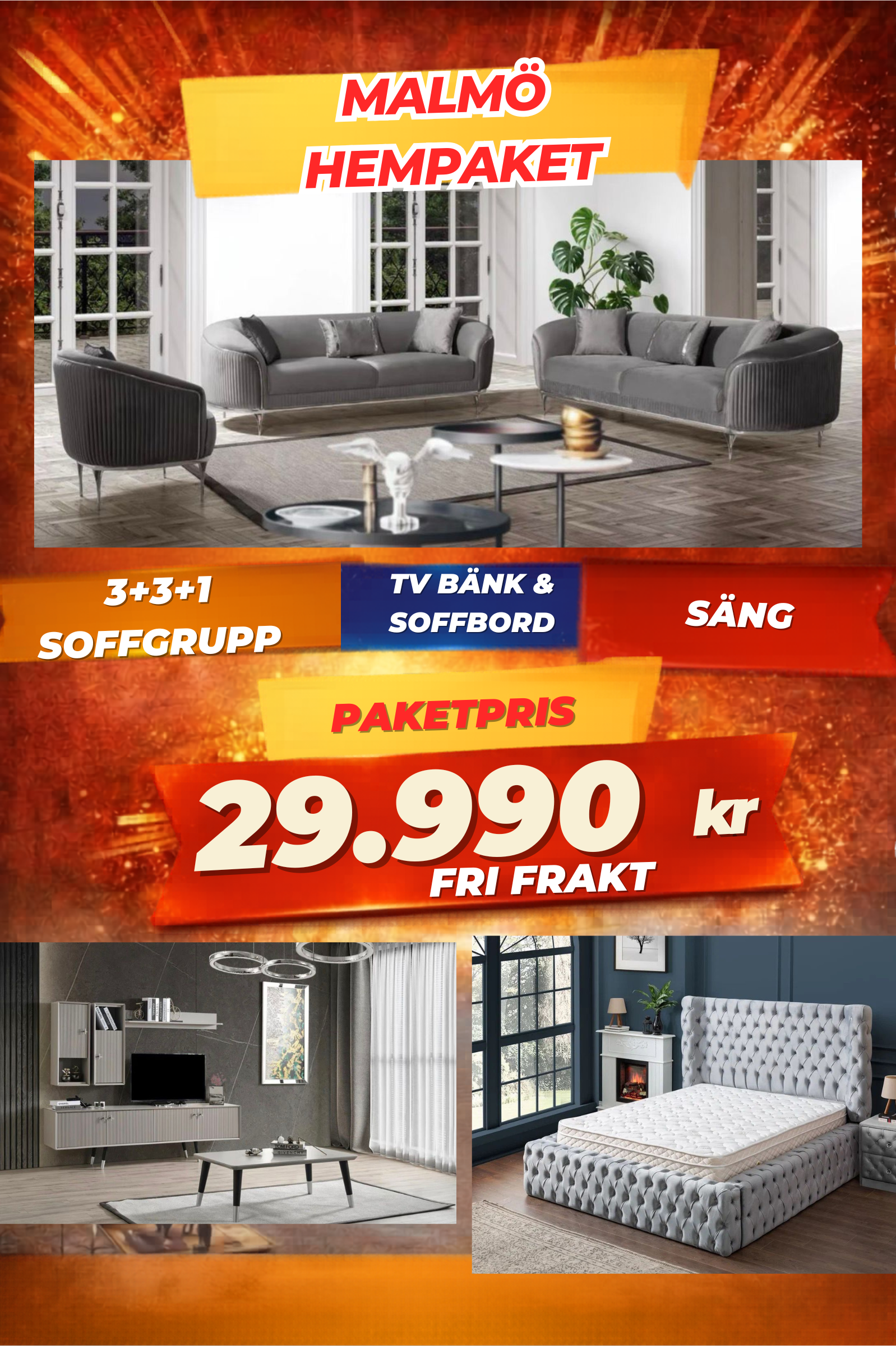 3️⃣ Malmö HemPaket (Soffgrupp – TV-bänk – Soffbord – Säng med förvaring)