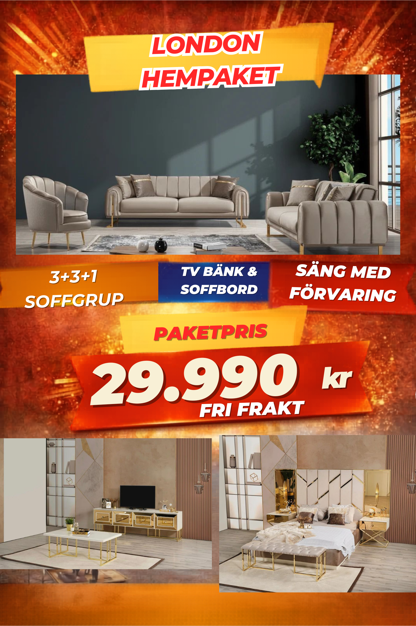 9️⃣ London HemPaket (Soffgrupp – TV-bänk – Soffbord – Säng med förvaring)